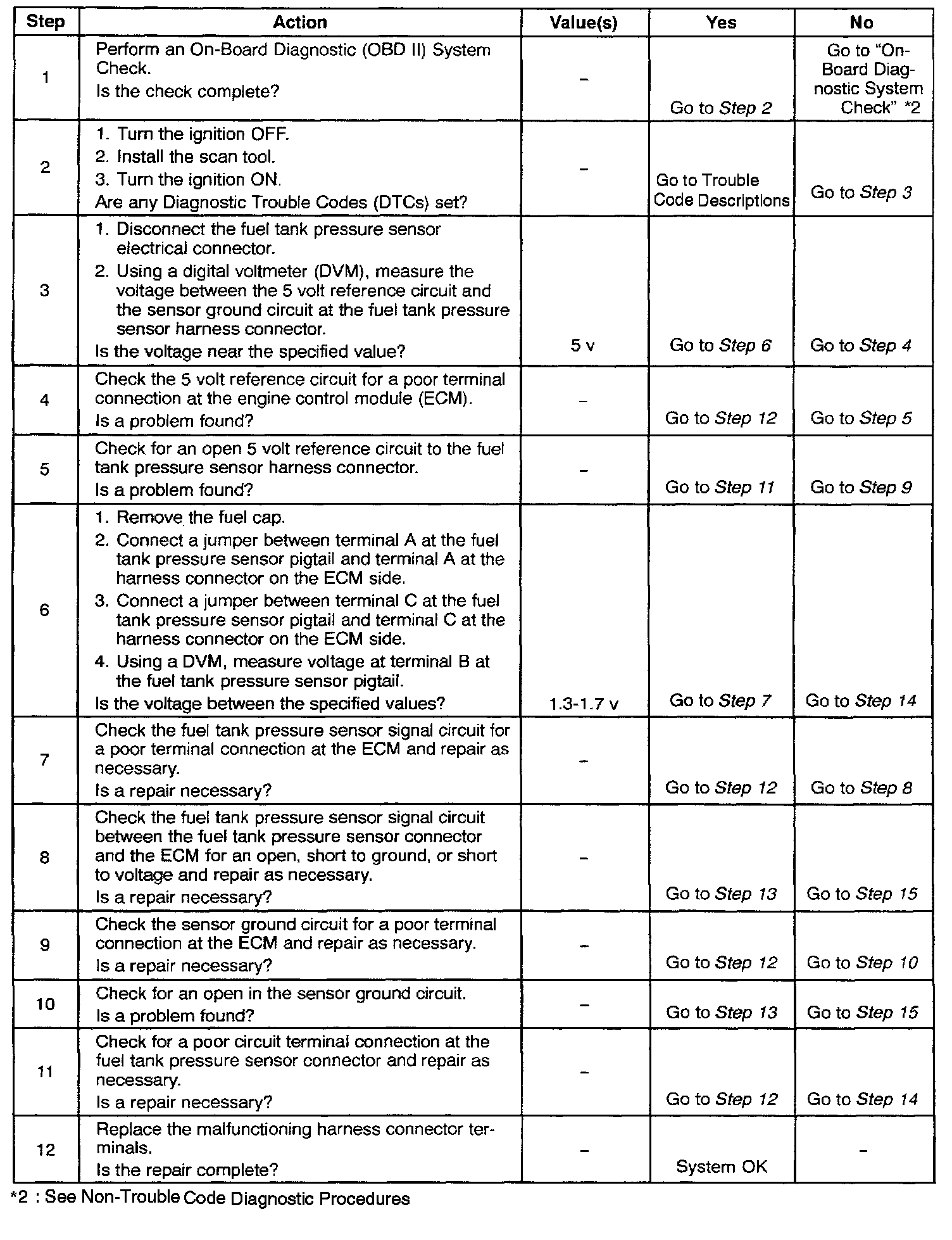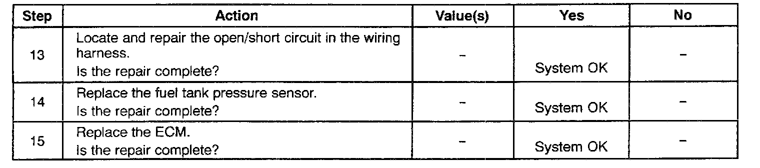 - Damaged harness. Inspect the wiring harness for damage. If the harness appears to be OK, observe the Fuel Tank Vacuum Pressure display on the scan tool while moving connectors and wiring harnesses related to the sensor. A change in the display will indicate the location of the fault.