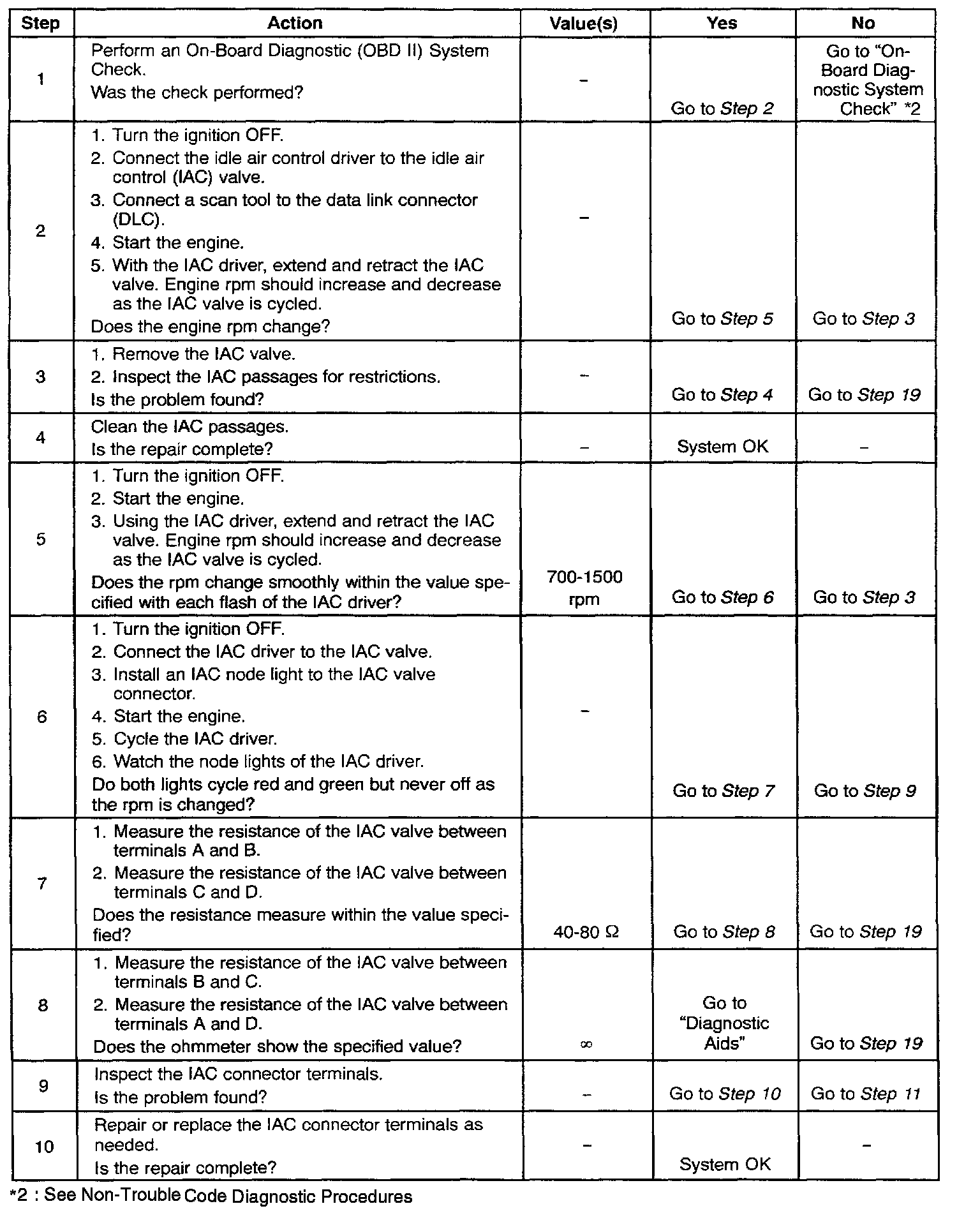 5. This step checks the quality of the IAC valve movement in step 2. Fully extending the IAC valve may cause an engine stall. This may be normal.