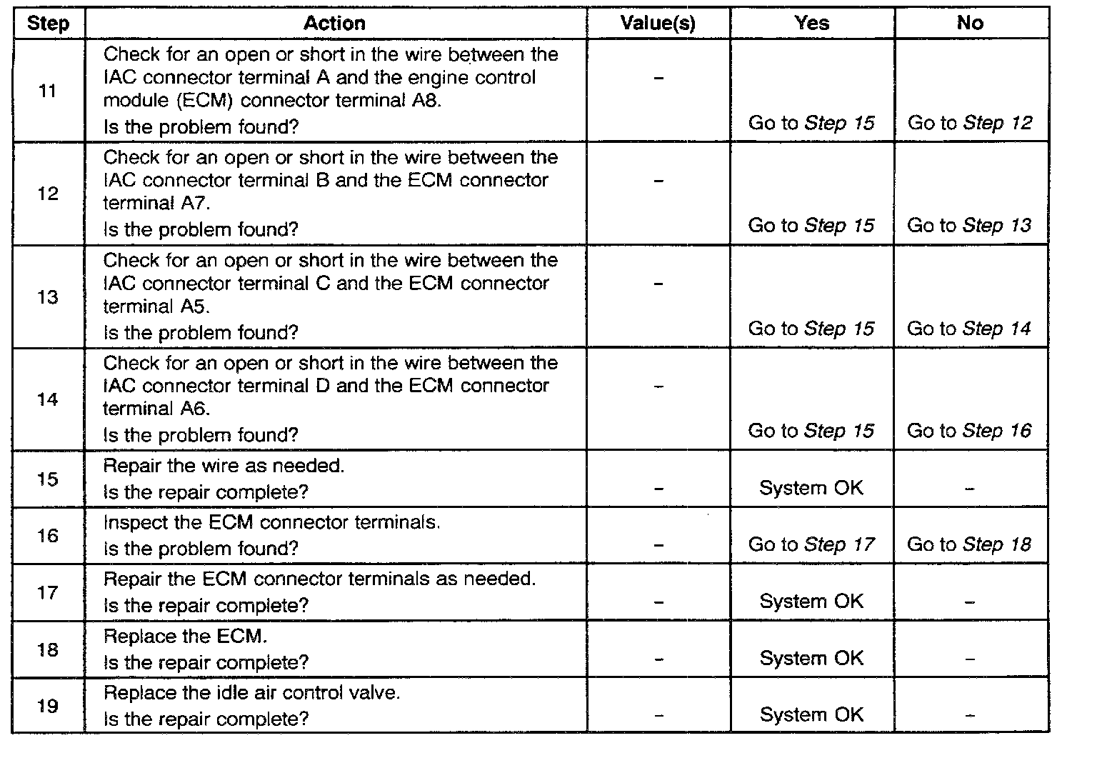 6. Steps 2 and 5 verify proper IAC valve operation. This step checks the IAC circuit for a wiring or engine control module (ECM) fault.