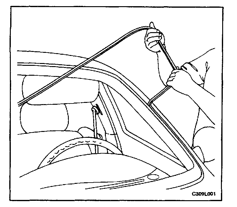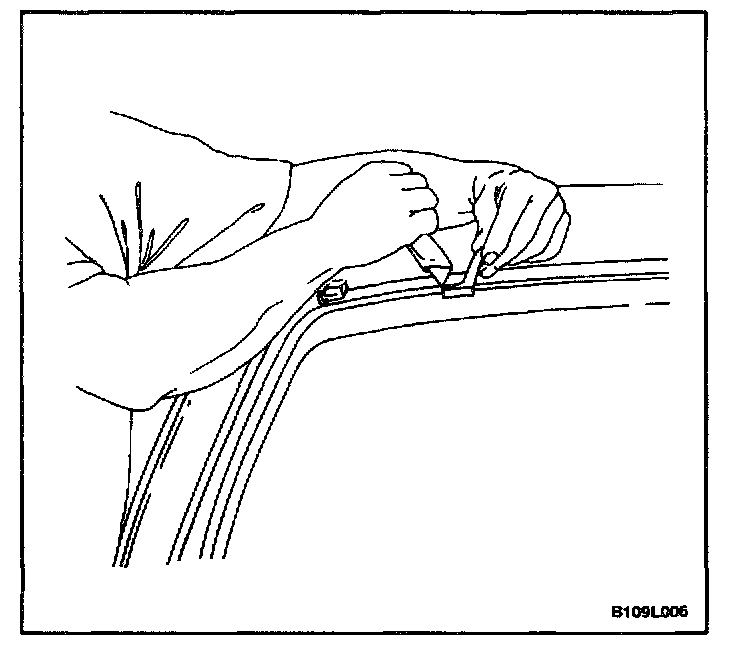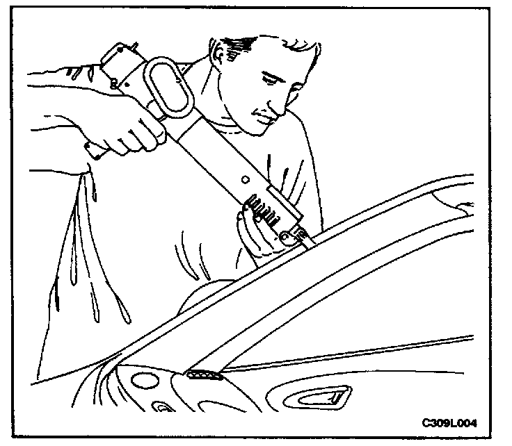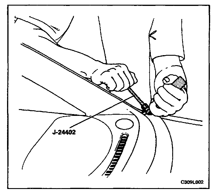 4. Using the glass sealant remover J-24402, cut the adhesive around the windshield.