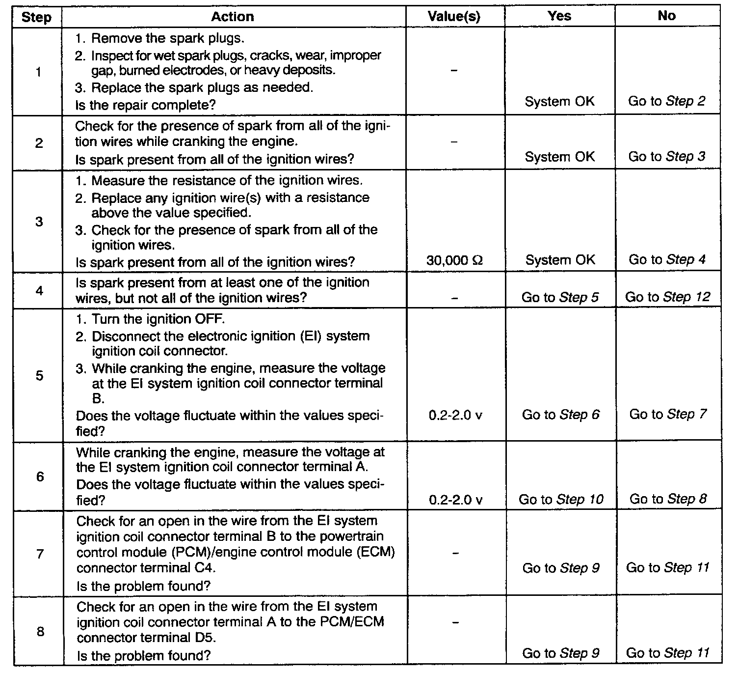 6. After confirming PCM/ECM inputs for the electronic spark timing to the EI system ignition coil are OK, it can be determined that a faulty EI system ignition coil is at fault.
