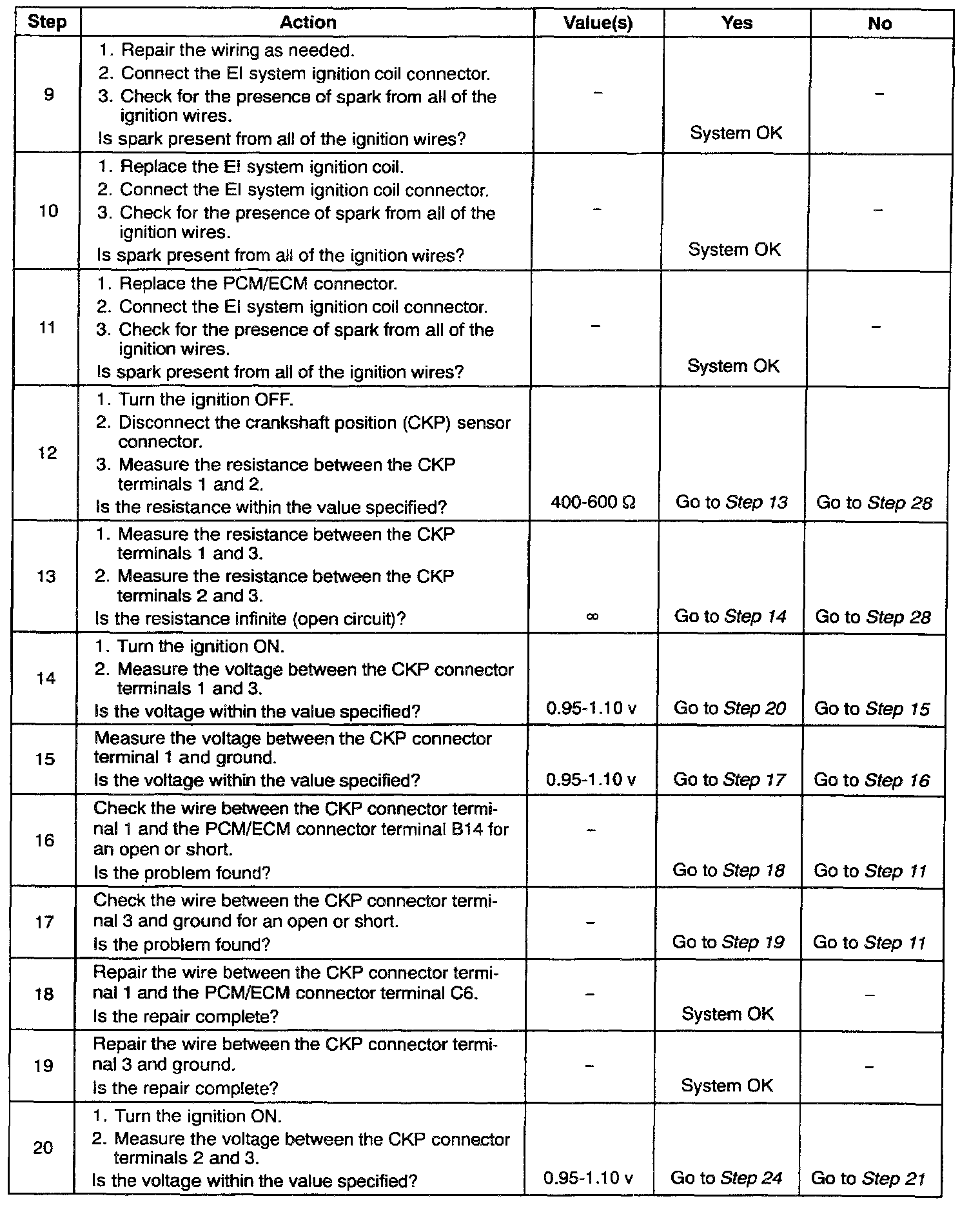 11. After confirming proper CKP inputs to the PCM/ECM and no wiring problems present, it can be determined that the PCM/ECM is at fault.