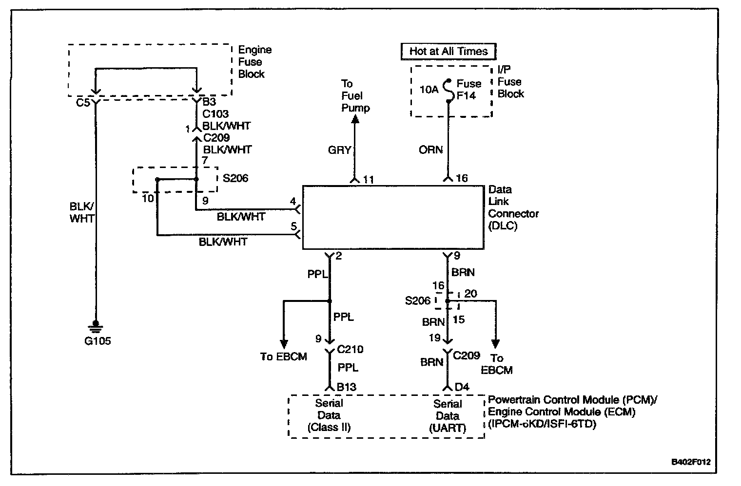 The provision for communicating with the powertrain control module (PCM)/engine control module (ECM) is the Data Link Connector (DLC). It is located under the instrument panel. The DLC is used to connect the scan tool. Battery power and ground is supplied for the scan tool through the DLC. The Class II serial data circuit to the DLC allows the PCM/ECM to communicate with the scan tool. A Universal Asynchronous Receiver Transmitter (UART) serial data line is used to communicate with the other modules such as the Electronic Brake Control Module (EBCM), the Supplemental Inflatable Restraint (SIR) system and the Instrument Panel Cluster (IPC).