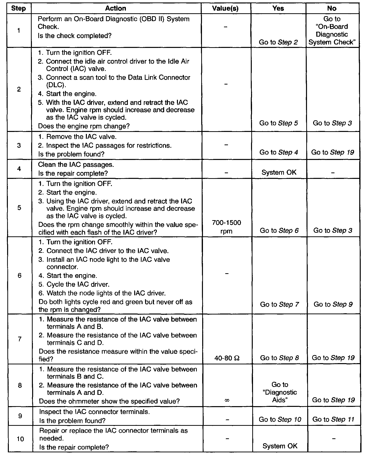 5. This step checks the quality of the IAC valve movement in step 2. Fully extending the IAC valve may cause an engine stall. This may be normal.
