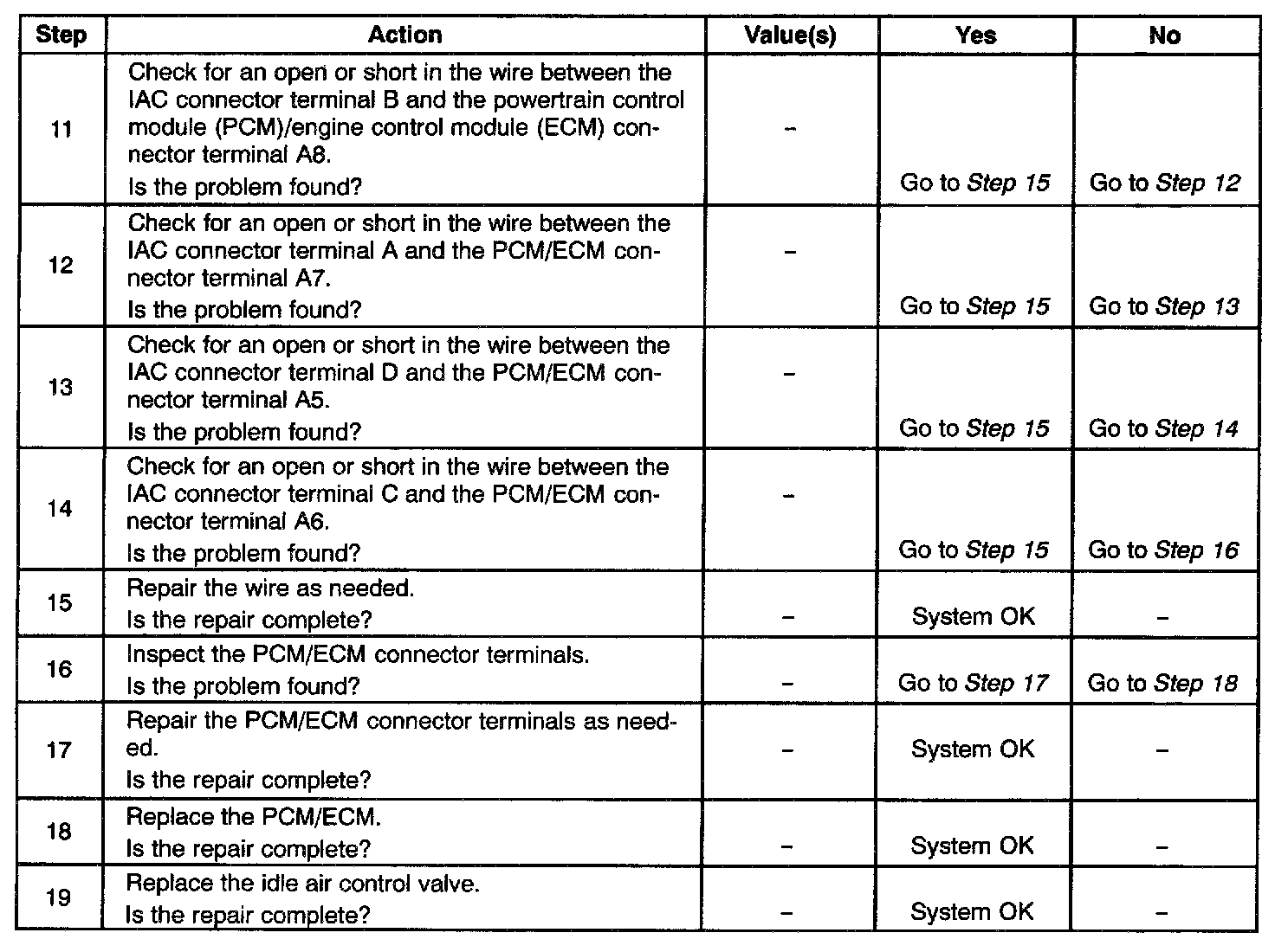 6. Steps 2 and 5 verify proper IAC valve operation. This step checks the IAC circuit for a wiring or PCM/ECM fault.