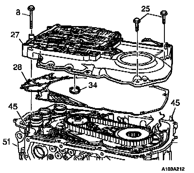 3. Install a new channel plate to case gasket (28) onto the transmission case (51).