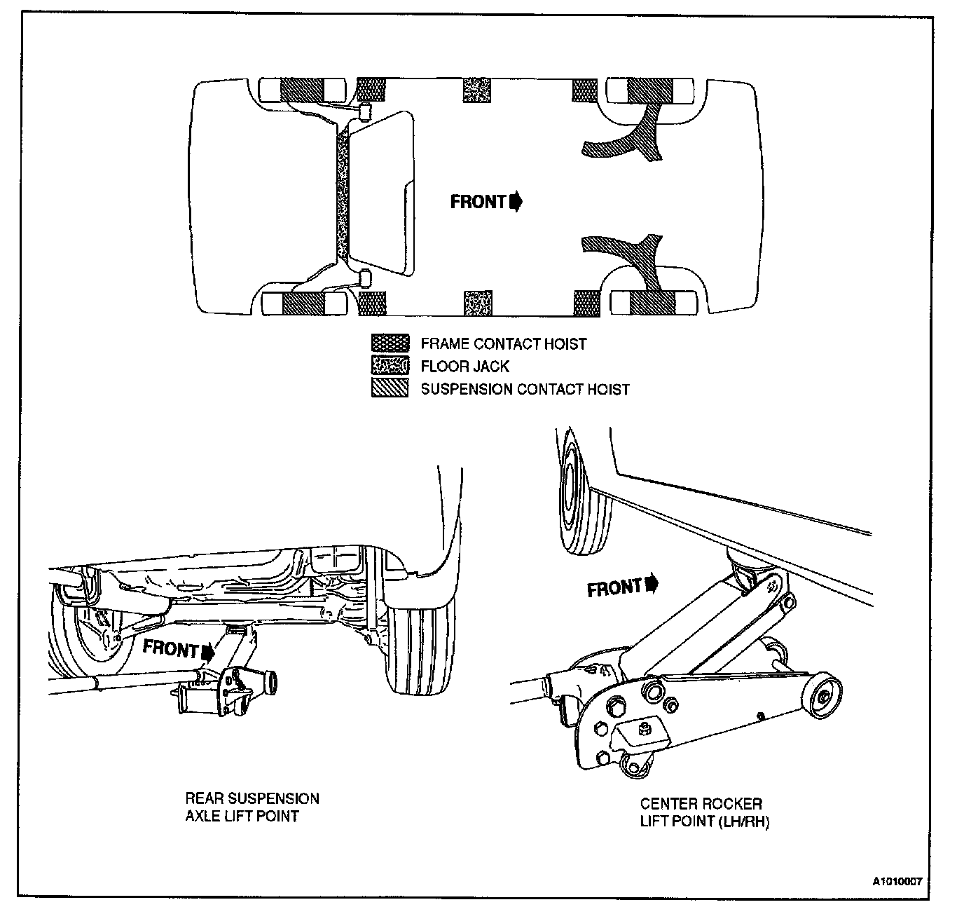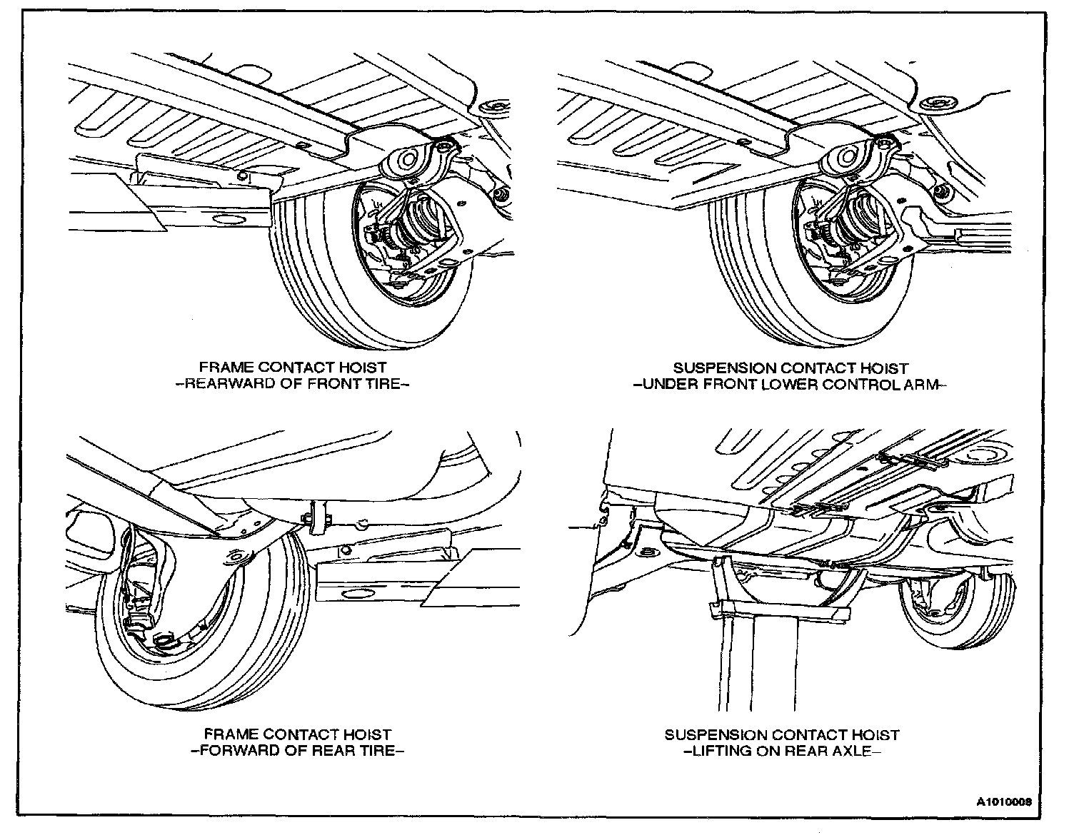 NOTE: To raise the vehicle, place the lifting equipment only at the points indicated. Failure to use these precise positions may result in permanent vehicle body deformation. Many dealer service facilities and service stations are equipped with automotive hoists that bear upon some parts of the frame in order to lift the vehicle. If any other hoist method is used, use special care to avoid damaging the fuel tank, the filler neck, the exhaust system, or the underbody.