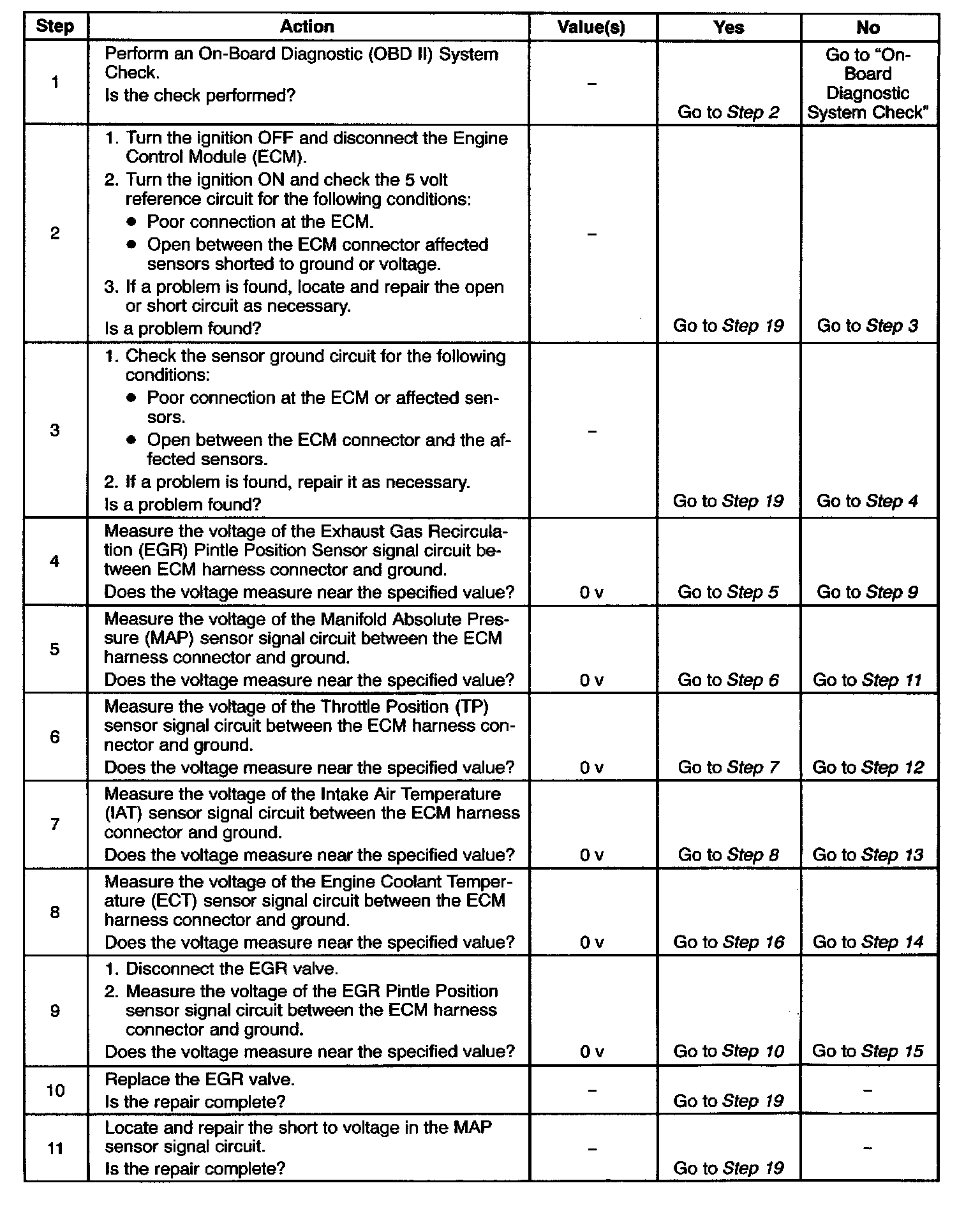 12 - 19. If a sensor input circuit has been shorted to voltage, ensure that the sensor has not been damaged. A damaged IAT or ECT sensor will continue to indicate a high voltage or low temperature after the affected circuit has been repaired. A damaged Air Conditioning Pressure (ACP), TP, MAP, Fuel Tank Pressure, or EGR Pintle Position sensor will indicate a high or low voltage or may be stuck at a fixed value after the affected circuit has been repaired. If the sensor has been damaged, replace it.