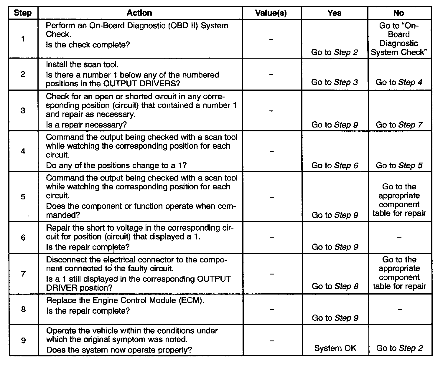 4. An open or short to ground will appear in the open positions on the scan tool only when it is not commanded by the ECM or scan tool, while a short to voltage will appear in the short positions on the scan tool only while the component is being commanded by the ECM or scan tool.