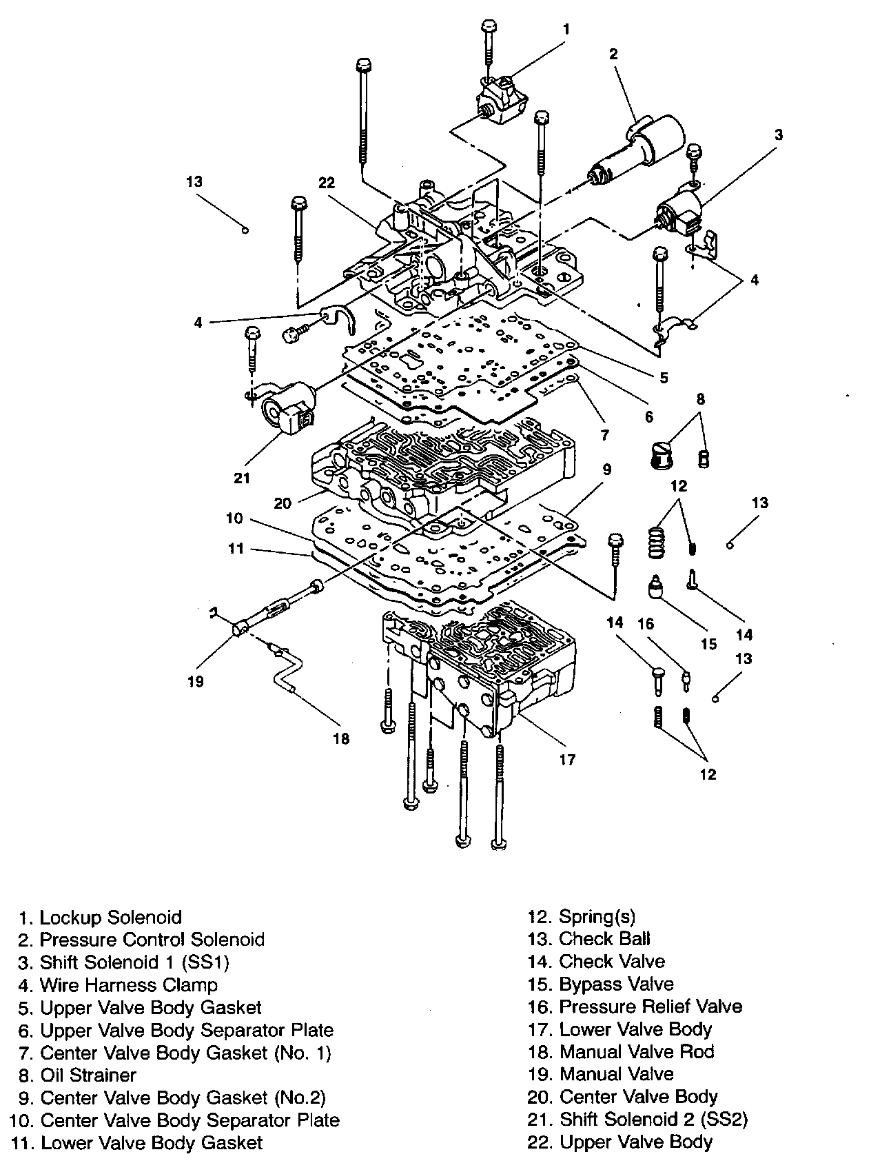 5. Turn the valve body assembly over and remove the five bolts from the upper valve body.