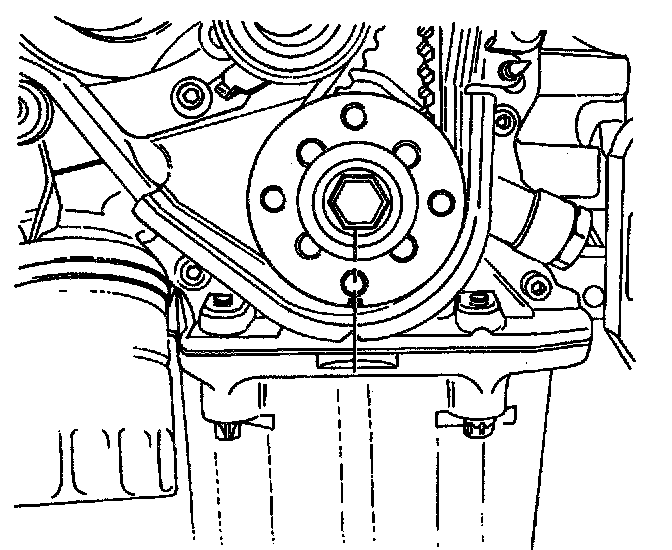 1. Align the timing mark on the crankshaft gear with the notch on the bottom of the rear timing belt cover.