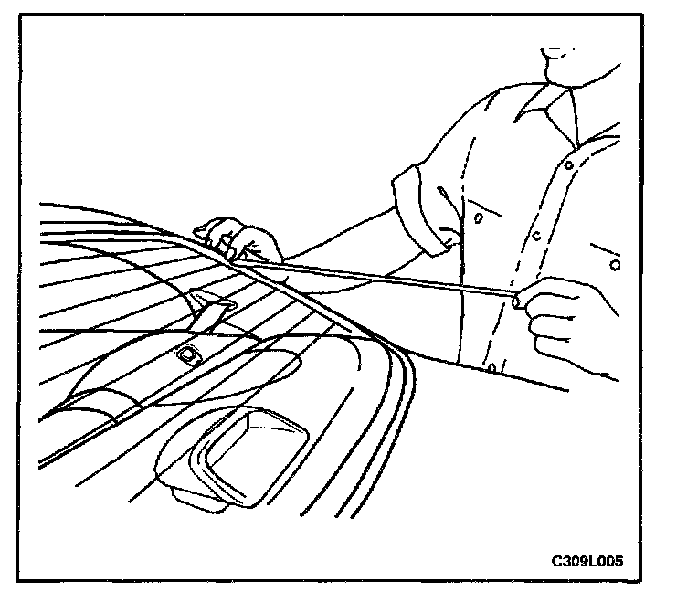 4. Using the glass sealant remover J-24402, cut the adhesive around the rear window.