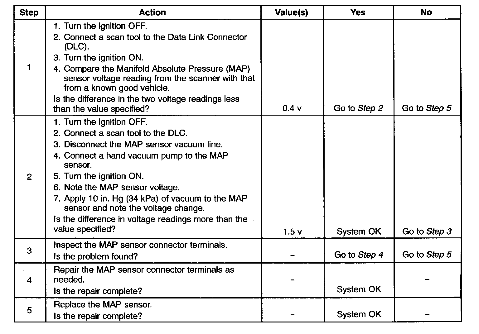 2. Applying 34 kPa (10 inches Hg) of vacuum to the MAP sensor should cause the voltage to change. Subtract the second voltage reading from the first. That voltage value should be more than 1.5 volts. When applying vacuum to the MAP sensor, the change in the voltage should happen instantly. A slow voltage change indicates a faulty MAP sensor.