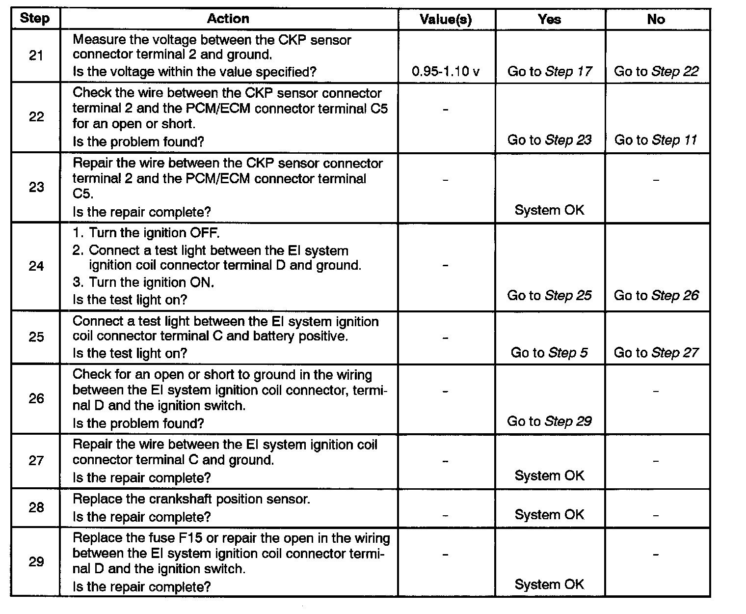 11. After confirming proper CKP sensor inputs to the PCM/ECM and no wiring problems present, it can be determined that the PCM/ECM is at fault.