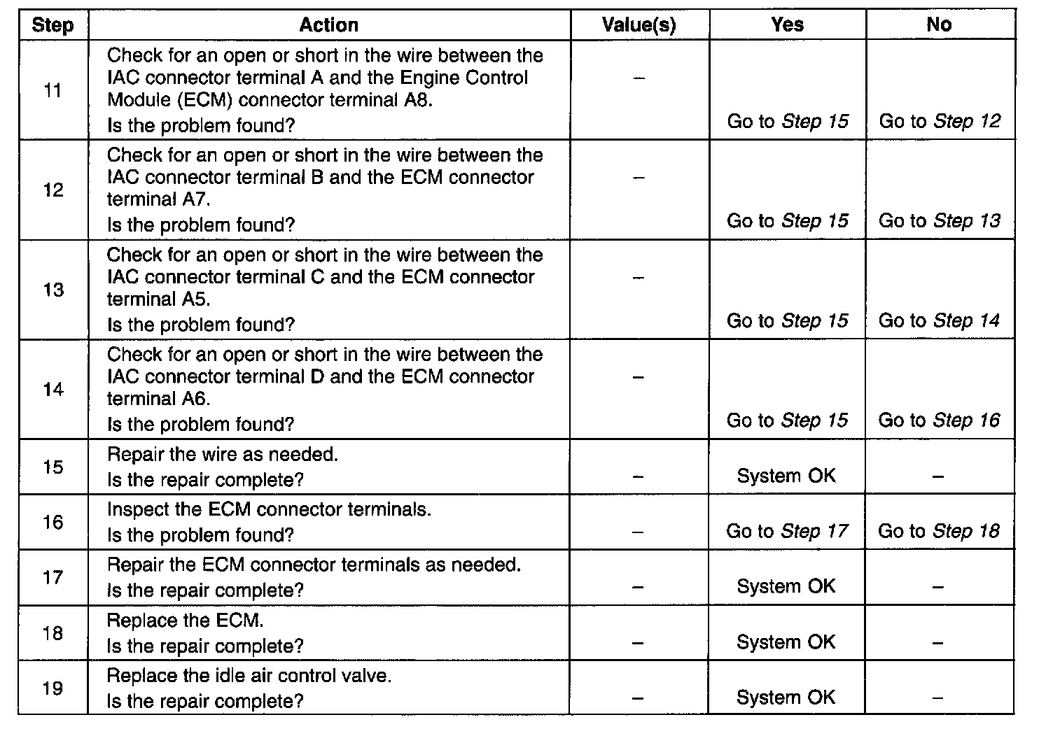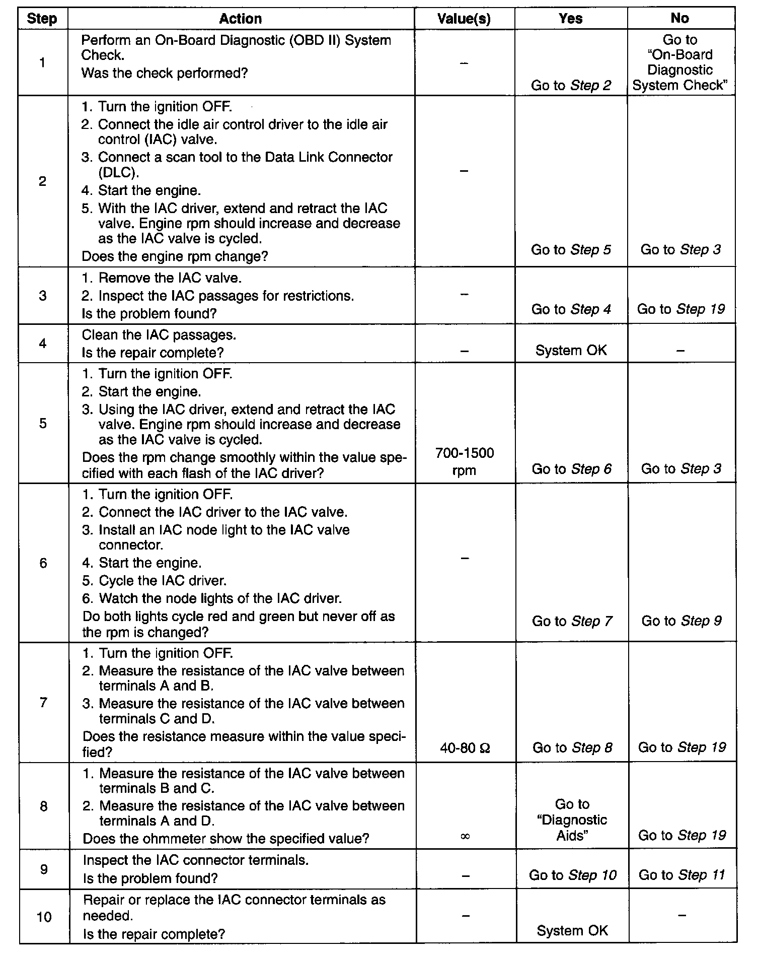 5. This step checks the quality of the IAC valve movement in step 2. Fully extending the IAC valve may cause an engine stall. This may be normal.