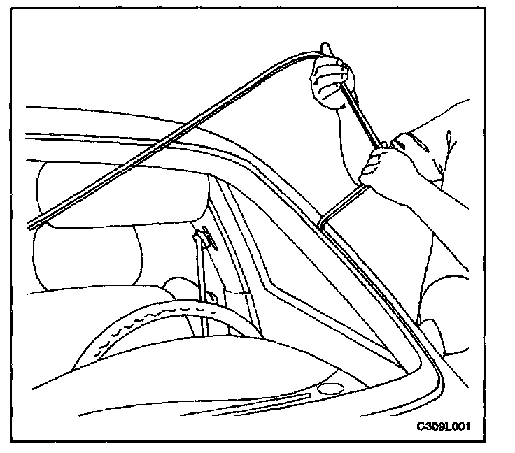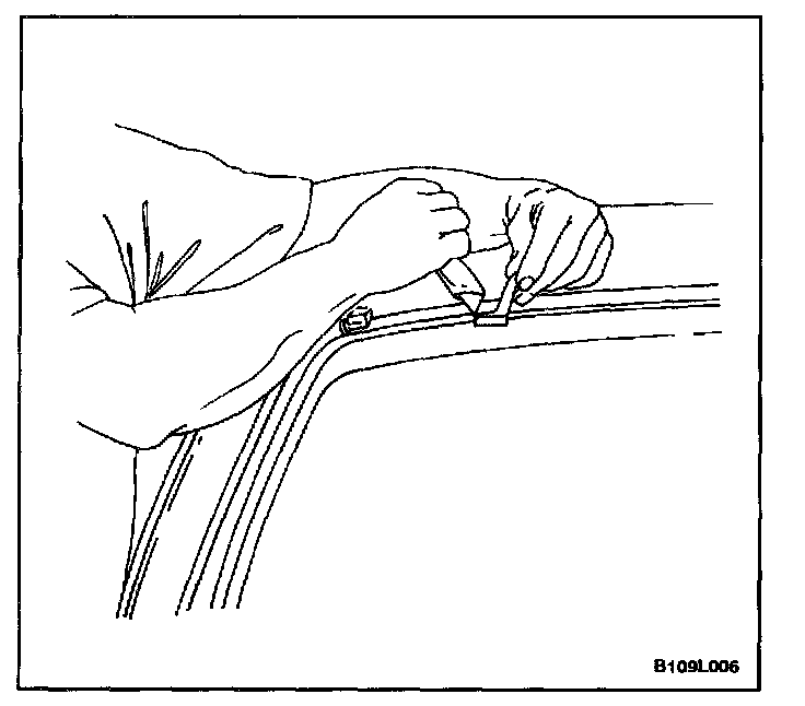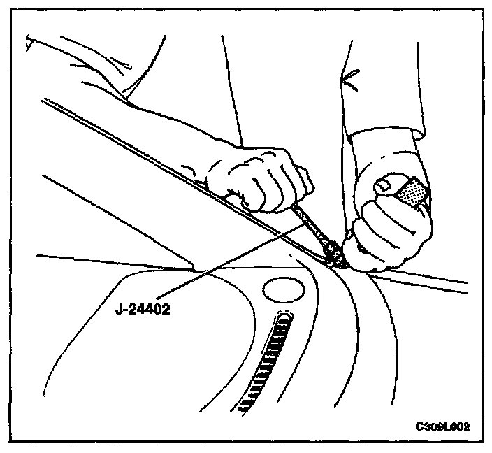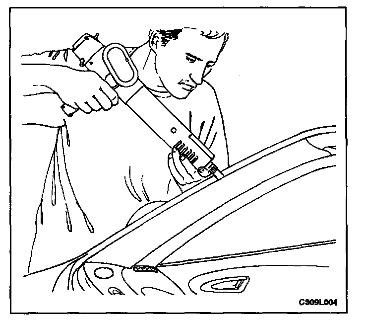 4. Using the glass sealant remover J-24402, cut the adhesive around the windshield.