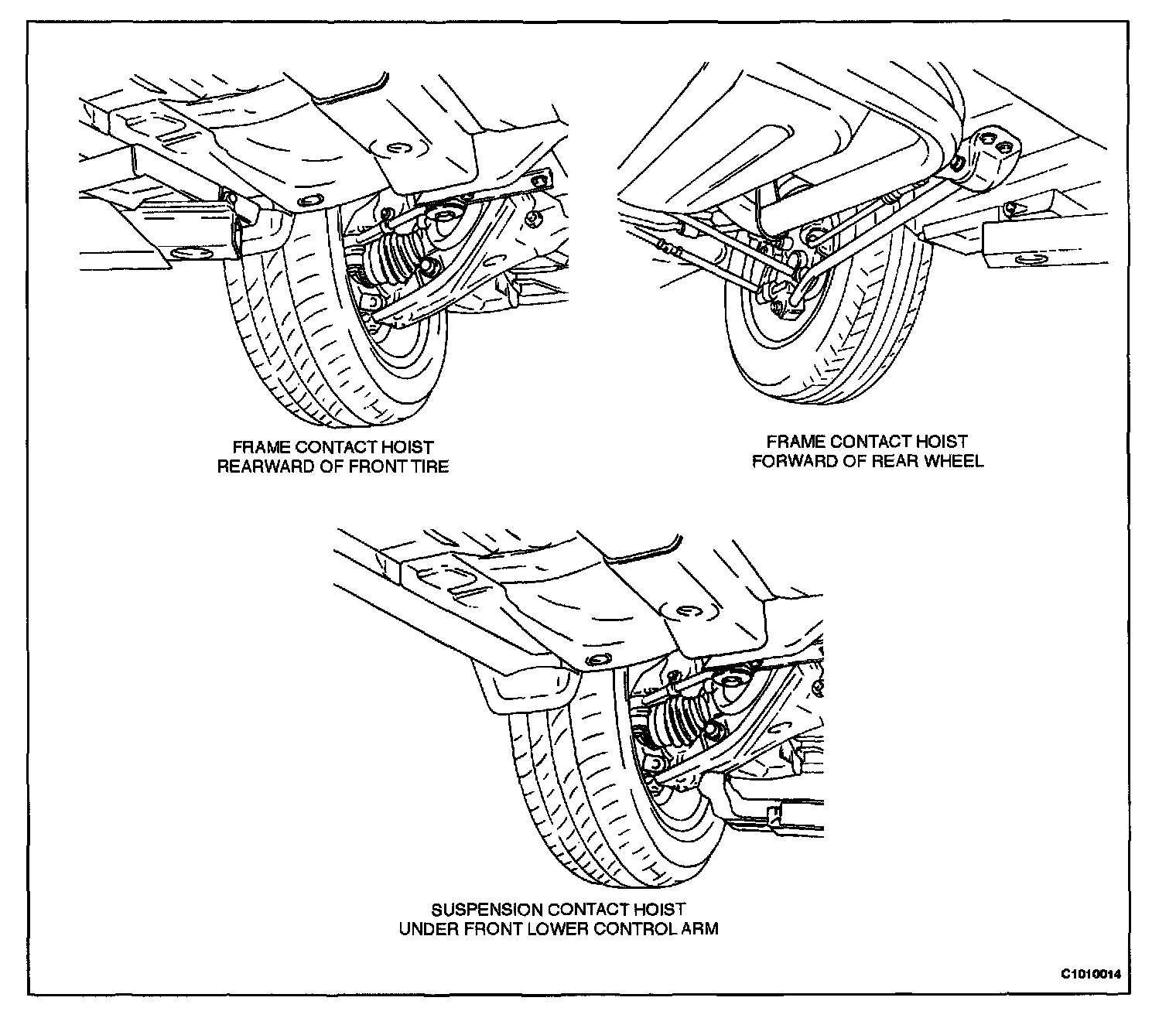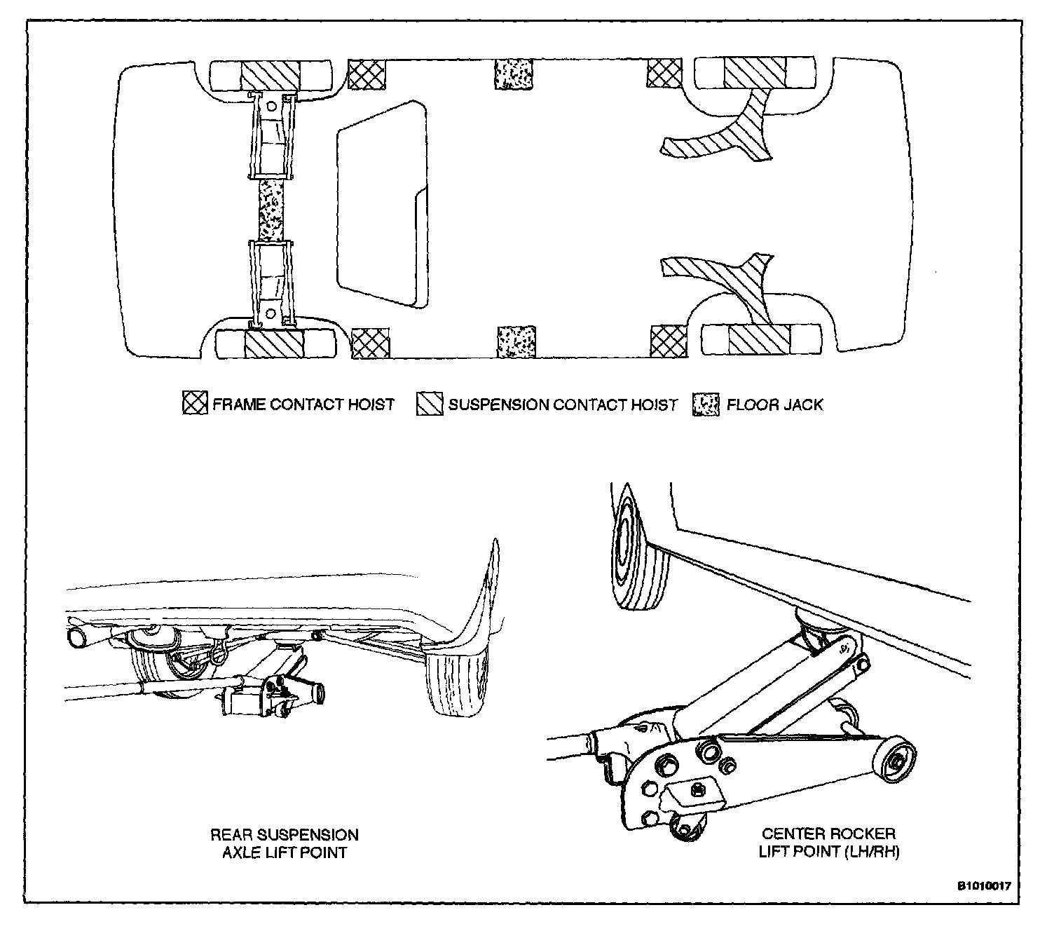NOTE: To raise the vehicle, place the lifting equipment only at the points indicated. Failure to use these precise positions may result in permanent body deformation. Many dealer service facilities and service stations are equipped with automotive hoists that bear upon some parts of the frame to lift the vehicle. If any other hoist method is used, use special care to avoid damaging the fuel tank, the filler neck, the exhaust system, or the underbody.