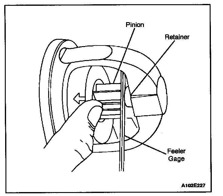 30. Push the pinion back as far as possible to take up any movement, and check the clearance with a feeler gauge. The clearance should be 0.25 to 3.56 mm (0.01 to 0.14 inch).
