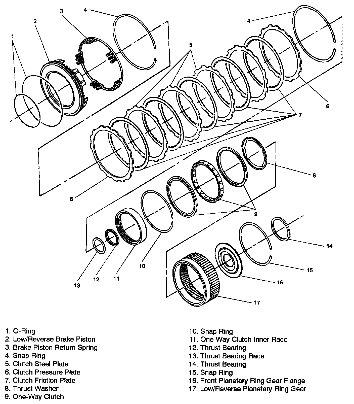 LOW/REVERSE BRAKE CLUTCH PISTON ASSEMBLY, FRONT PLANETARY RING GEAR AND ONE-WAY CLUTCH