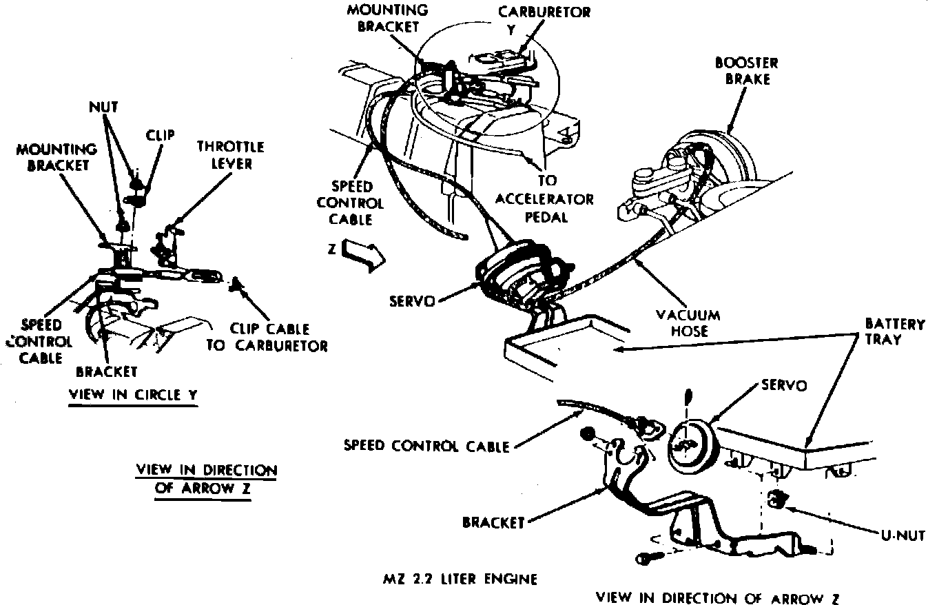Fig. 18 Speed control cable installation. 1982-84 Rampage, 1983 Scamp & 1984-85 Mini-Vans/Wagons w/2.2L engine: