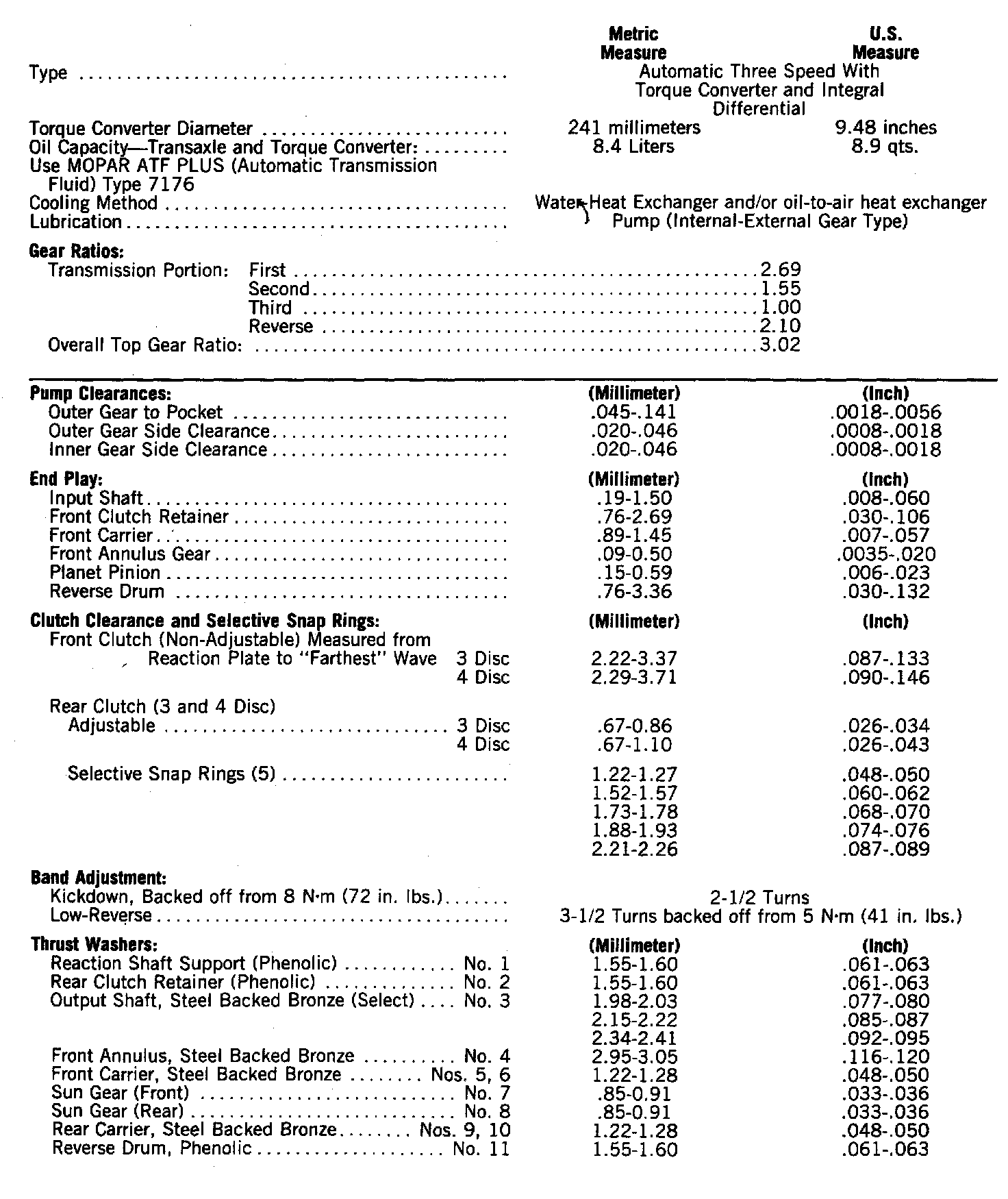 A-413 3-Speed TORQUEFLITE Specifications: