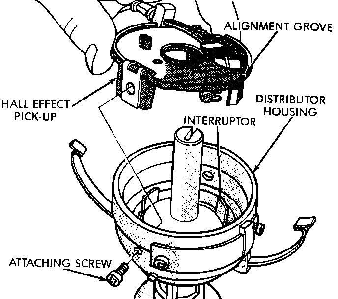 2. Remove both Hall effect pick-up attaching screws on opposite sides of the distributor housing and carefully lift the Hall effect pick-up assembly from the distributor housing.