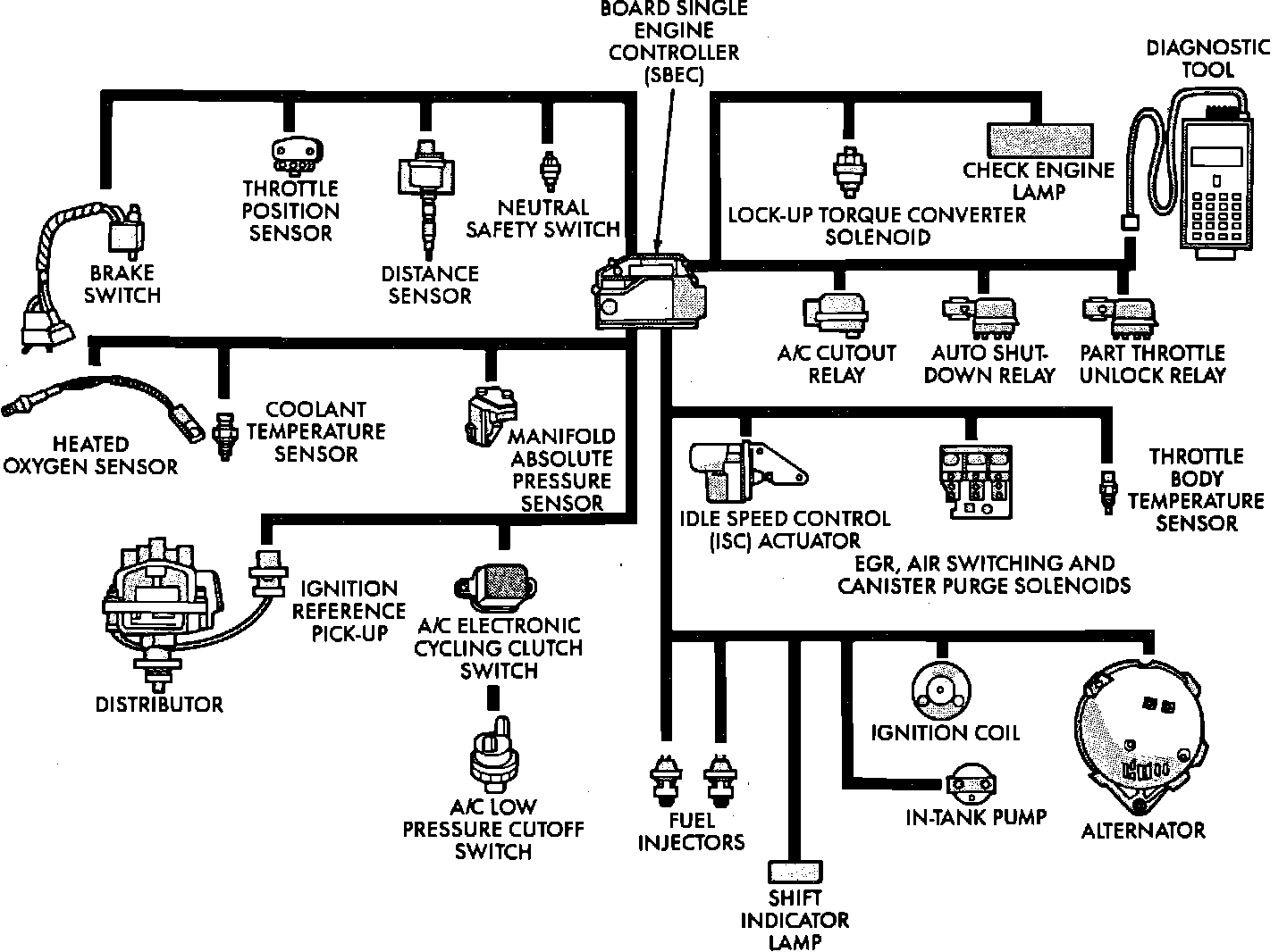 Various sensors provide necessary input for the SBEC to function correctly. These include the Manifold Absolute Pressure Sensor, Throttle Position Sensor, Oxygen Sensor, Coolant Temperature Sensor, and Vehicle Distance Sensors. In addition to these sensors, various switches and relays are used to carry out commands or outputs from the SBEC.