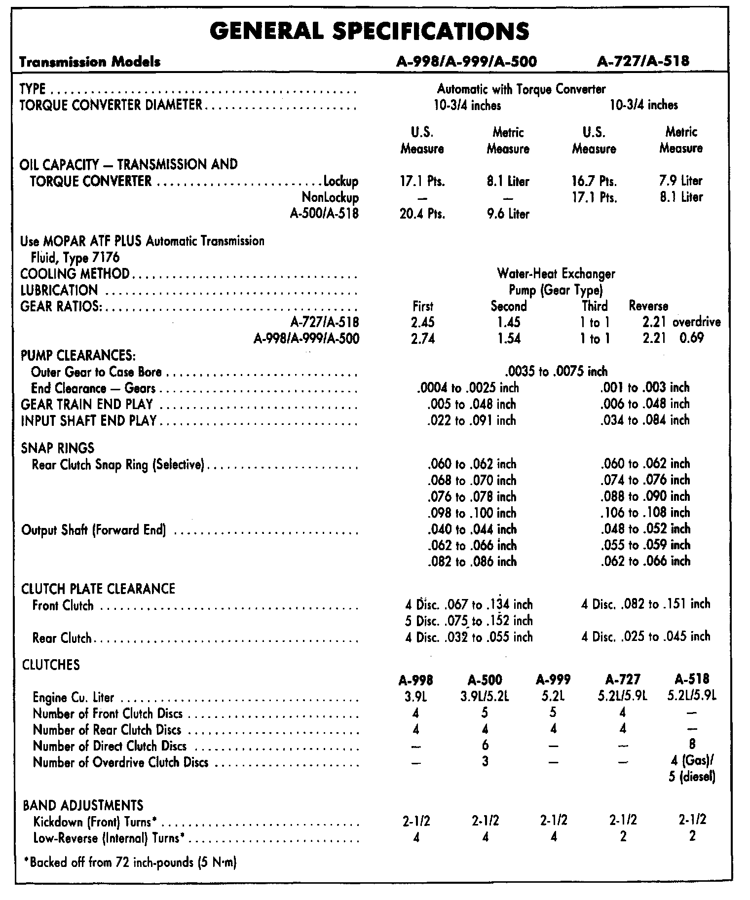 Models, A-998/A-999/A-500/A-727/A-518, Specifications: