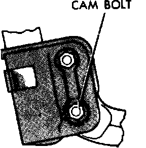To adjust camber, loosen cam and through bolts. Rotate upper cam bolt to move top of wheel in or out to achieve specified camber angle.