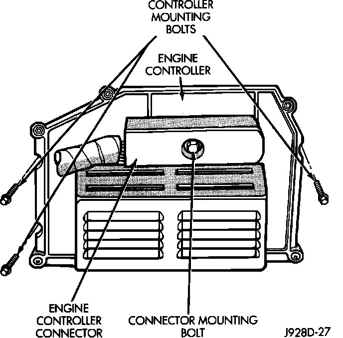 6. Remove the three engine controller-to-mounting bracket bolts. Do not remove the engine controller mounting bracket from the fender.