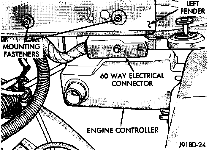 The engine controller is located in the engine compartment behind the battery and under the left front fender. An air tube connects the controller to the air cleaner intake tube.