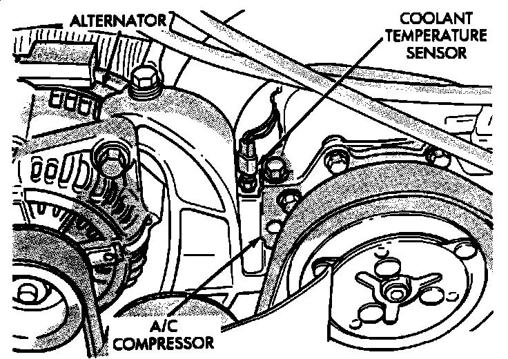 NOTE: Engines with air conditioning: When removing the connector from sensor, do not pull directly on wiring harness. Fabricate an L shaped hook tool from a coat hanger (approximately eight inches long). Place the hook part of tool under the connector for removal. The connector is snapped onto the sensor. It is not equipped with a lock type tab.