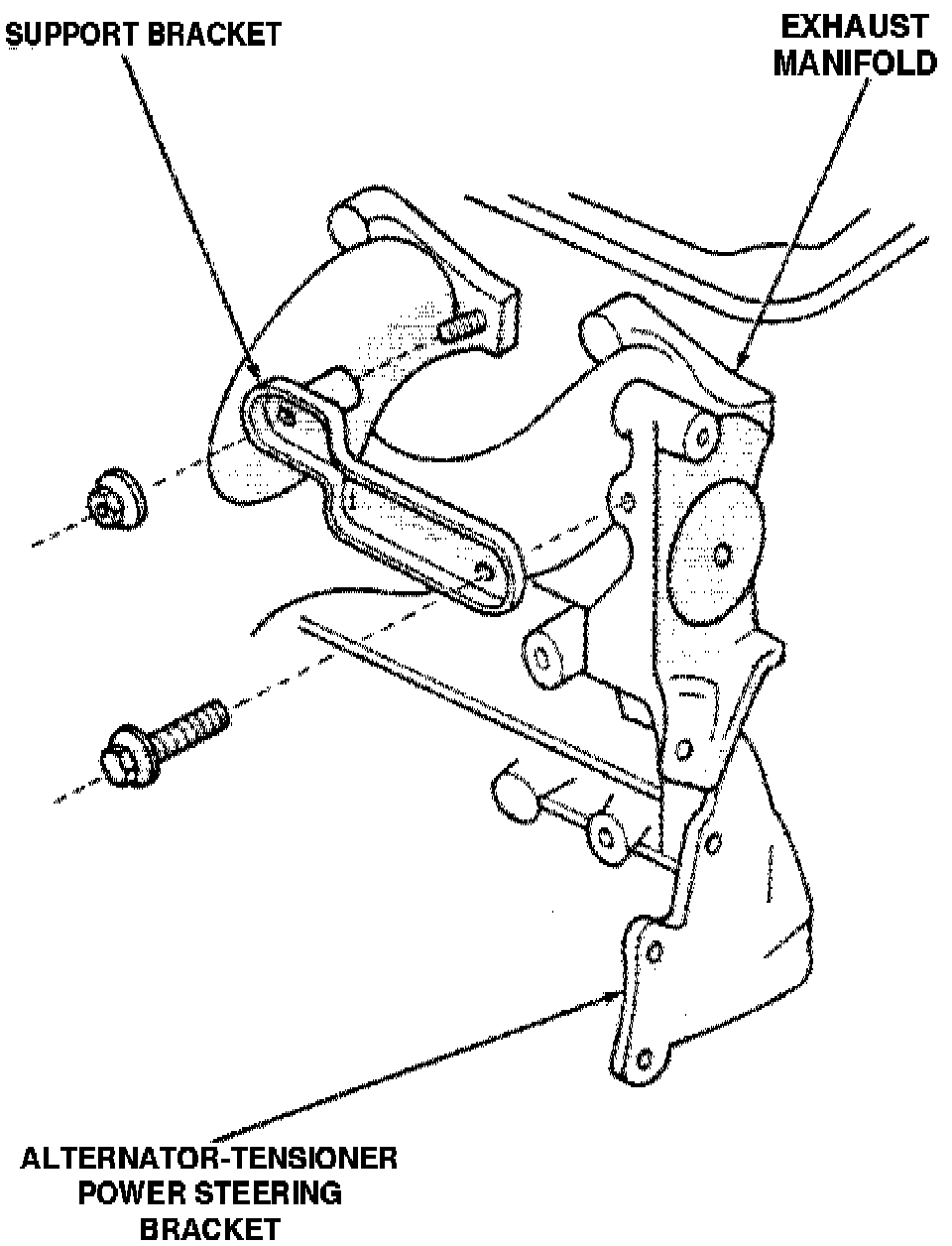 3. Remove alternator/tensioner/power steering bracket bolt, then the tensioner stud nut and tensioner.