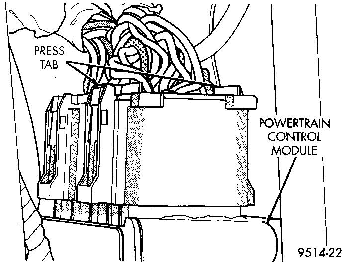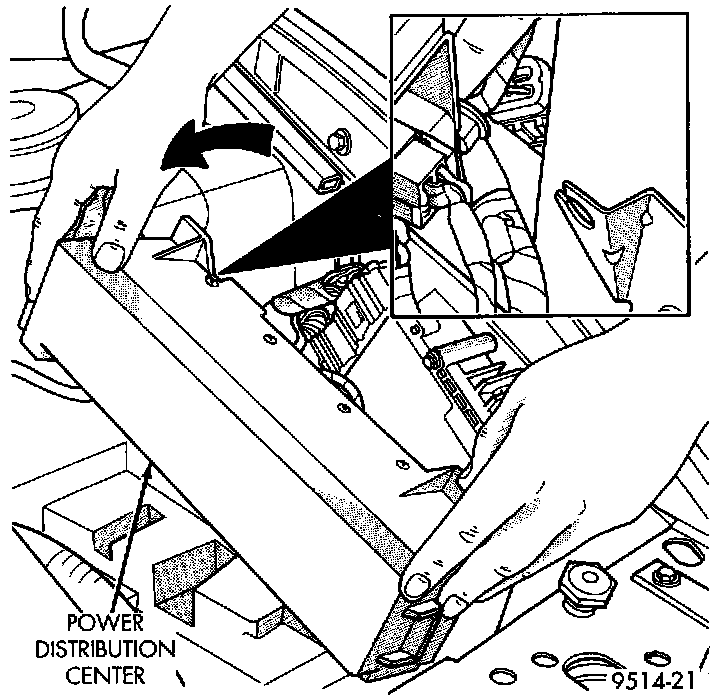 7. Pull PDC rearward to remove from front bracket. Lay PDC aside to allow access to Powertrain Control Module (PCM).