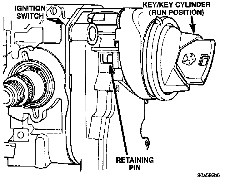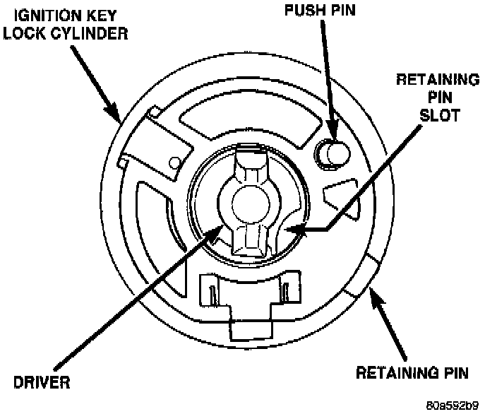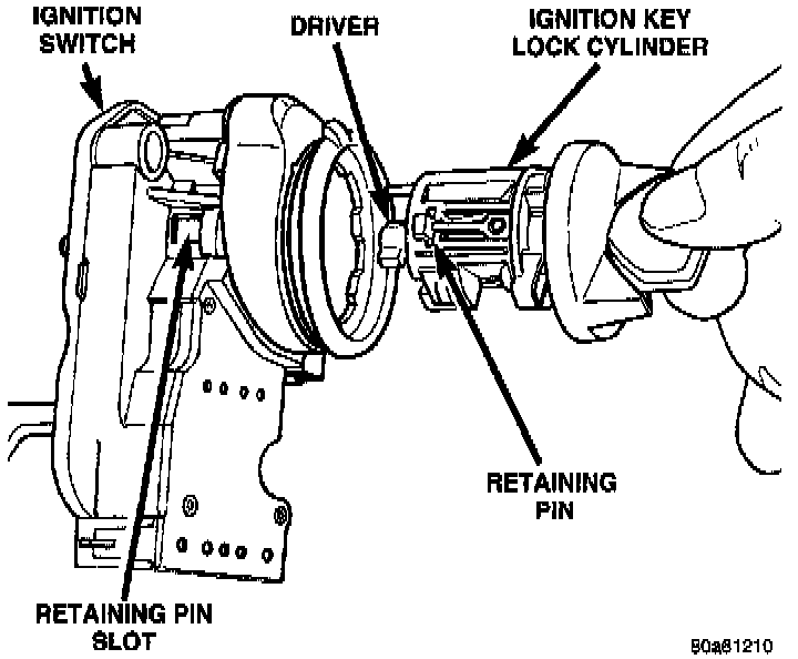 b. Press in on retaining pin while pulling key cylinder from ignition switch.