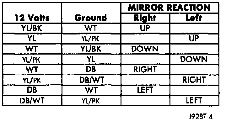 7. Use two jumper wires, one connected to a 12-volt battery feed, and the other connected to a good body ground. See the Power Mirror Test chart for the correct jumper wire connections at the power mirror switch wire harness connector (wire harness side, not switch side). If the mirror(s) don't respond as indicated in the chart, remove the mirror as described and check those circuits between the mirror and the switch for a short or open. If not OK, repair the circuits as required. If the circuits are OK, replace the faulty power outside mirror assembly.
