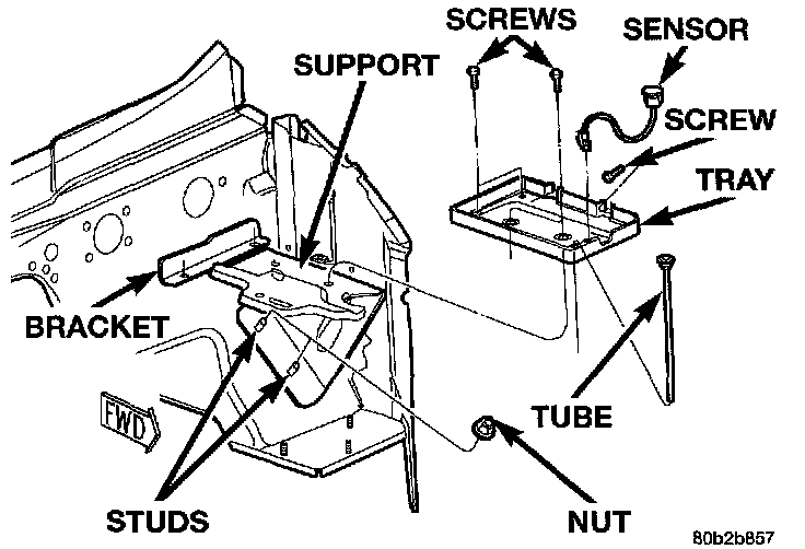 1. Feed pigtail harness through hole in top of battery tray and press sensor into top of battery tray.