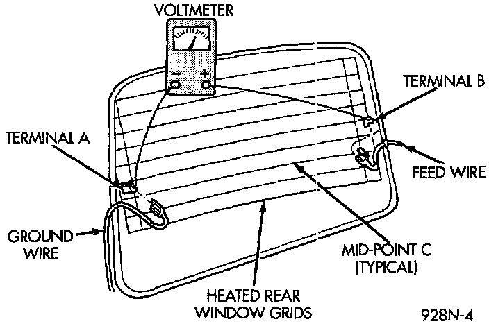2. Using a ammeter on the battery, turn the rear defogger control switch to the ON position, a distinct increase in amperage draw should be noted.