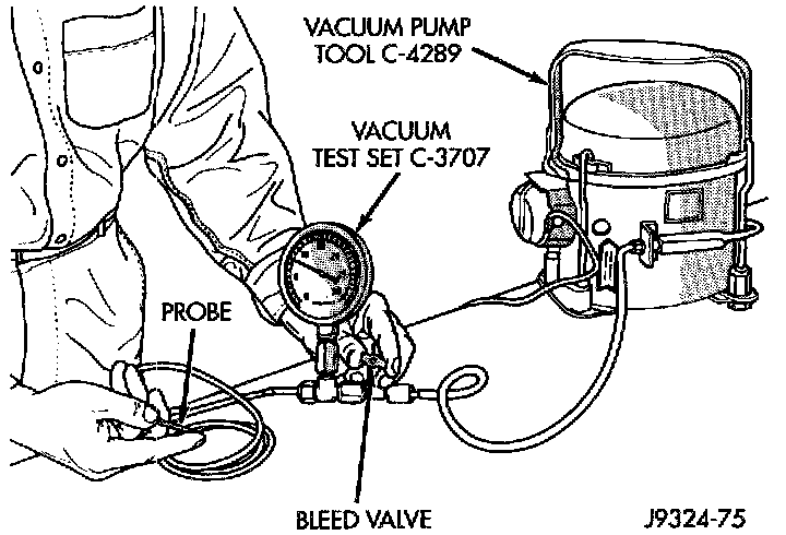 Use an adjustable vacuum test set (Special Tool C-3707) and a suitable vacuum pump to test the heater-A/C vacuum control system. With a finger placed over the end of the vacuum test hose probe, adjust the bleed valve on the test set gauge to obtain a vacuum of exactly 27 kPa (8 in. Hg.). Release and block the end of the probe several times to verify that the vacuum reading returns to the exact 27 kPa (8 in. Hg.) setting. Otherwise, a false reading will be obtained during testing.