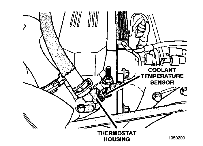 The engine coolant temperature sensor is installed in the thermostat housing and protrudes into the water jacket.