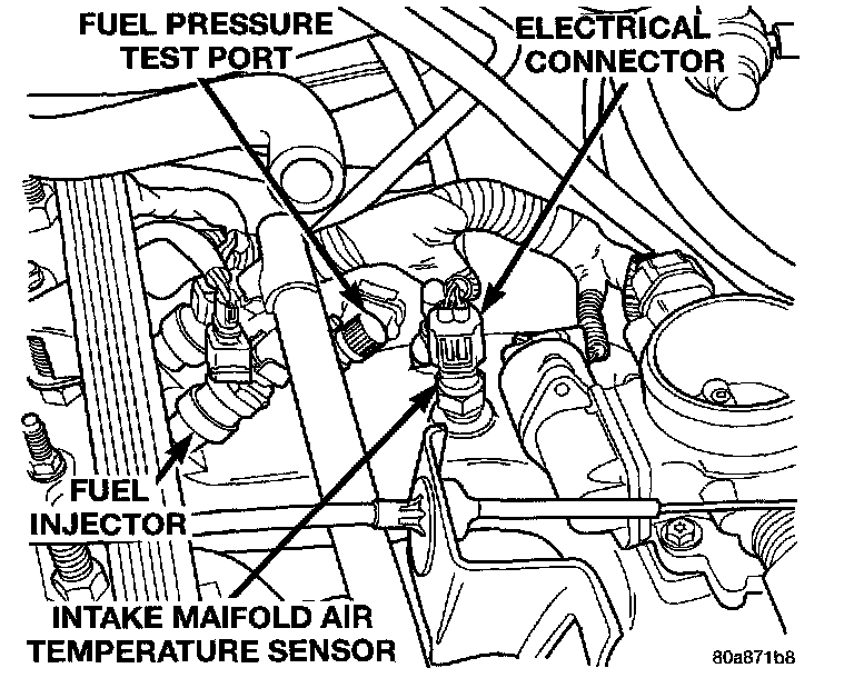 The intake manifold air temperature sensor is installed in the intake manifold with the sensor element extending into the air stream. The sensor provides an input voltage to the powertrain control module (PCM) indicating intake manifold air temperature. The input is used along with inputs from other sensors to determine injector pulse width. As the temperature of the air-fuel stream in the manifold varies, the sensor resistance changes. This results in a different input voltage to the PCM.