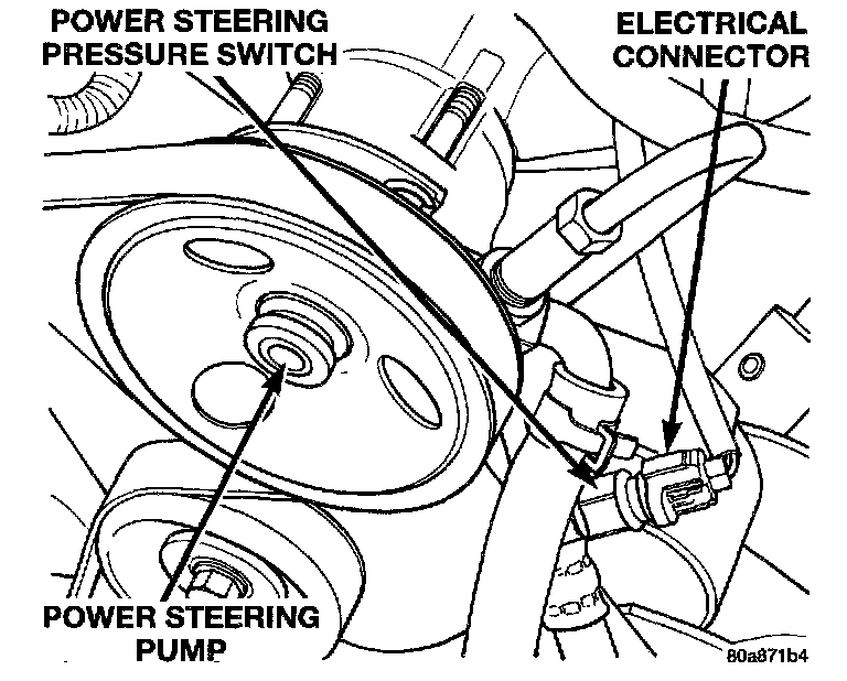A pressure sensing switch is included in the power steering system (mounted on the high-pressure line). This switch will be used only on vehicles equipped with a 2.5L engine and power steering. The switch provides an input to the Powertrain Control Module (PCM). This input is provided during periods of high pump load and low engine rpm; such as during parking maneuvers. The PCM will then increase the idle speed through the Idle Air Control (IAC) motor. This is done to prevent the engine from stalling under the increased load.