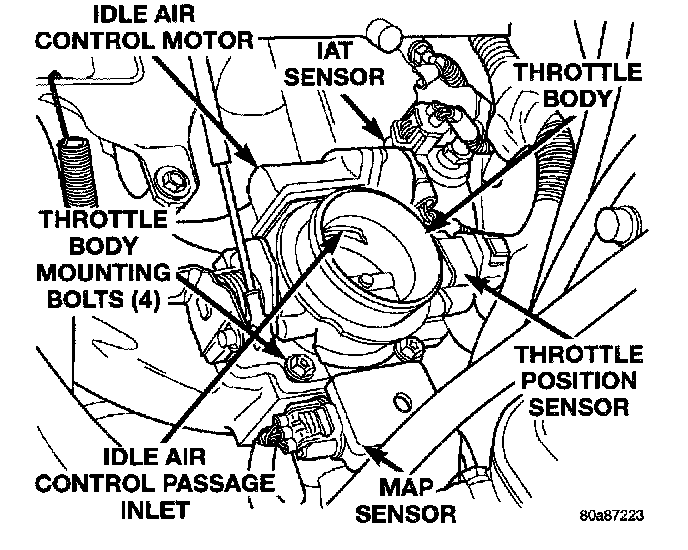 Idle Air Control Motor, IAT Sensor, Throttle Body, Throttle Position Sensor, MAP Sensor, Idle Air Control Passage Inlet, Throttle Body Mounting Bolts(4):