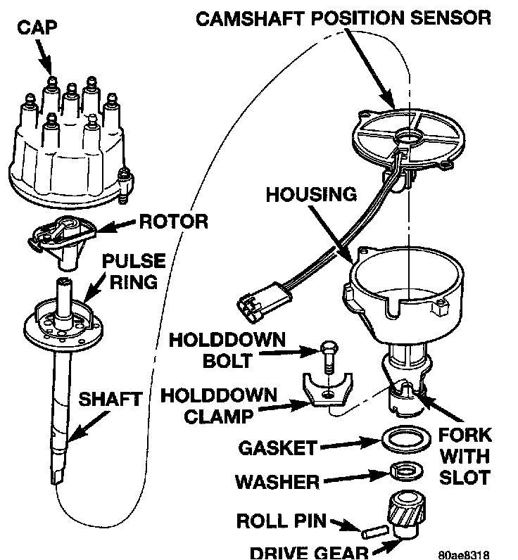 A fork with a slot is supplied on the bottom of the distributor housing where the housing base seats against the engine block. The centerline of the slot aligns with the distributor holddown bolt hole in the engine block. Because of the fork, the distributor cannot be rotated. Distributor rotation is not necessary as all ignition timing requirements are handled by the powertrain control module (PCM).