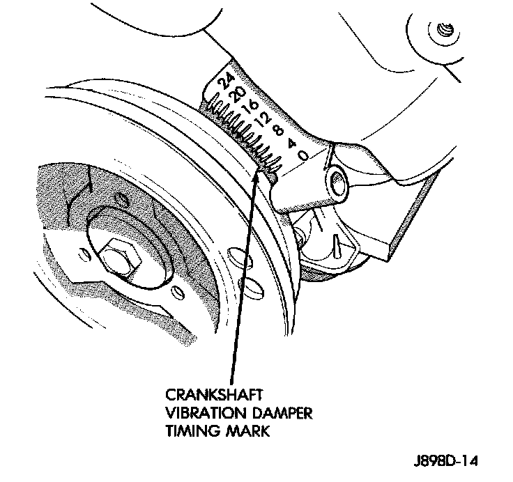 8. Slowly continue to rotate engine. Do this until timing index mark on vibration damper pulley aligns with top dead center (TDC) mark (0 degree) on timing degree scale. Always rotate engine in direction of normal rotation. Do not rotate engine backward to align timing marks.