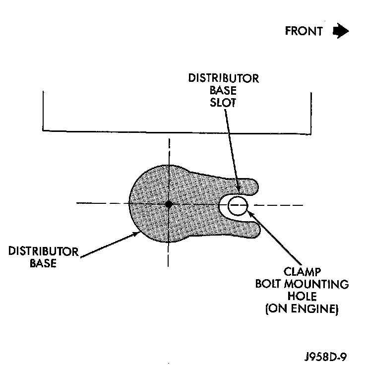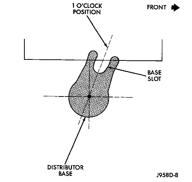 - centerline of slot at base of distributor is aligned to centerline of distributor holddown bolt hole on engine. In this position, holddown bolt should easily pass through slot and into engine.