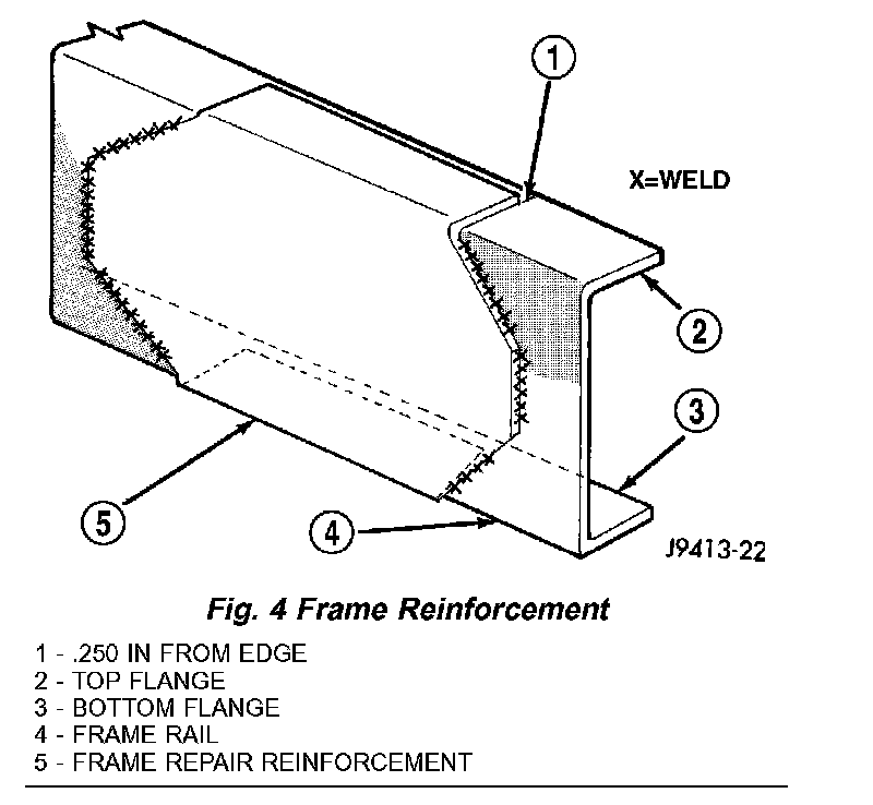 4. If necessary when a side rail is repaired, grind the weld smooth and install a reinforcement channel (Fig. 4) over the repaired area.