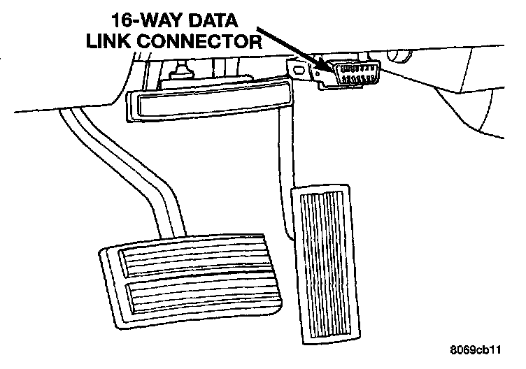 The 16-way data link connector (diagnostic scan tool connector) links the Diagnostic Readout Box (DRB) scan tool or the Mopar Diagnostic System (MDS) with the Powertrain Control Module (PCM). The data link connector is located under the instrument panel to the left of the steering column. For operation of the DRB scan tool, refer to the appropriate Powertrain Diagnostic Procedures.
