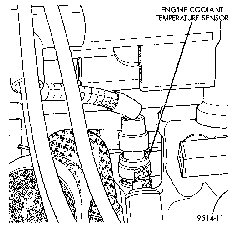 The coolant sensor threads into the top of the thermostat housing. New sensors have sealant applied to the threads.