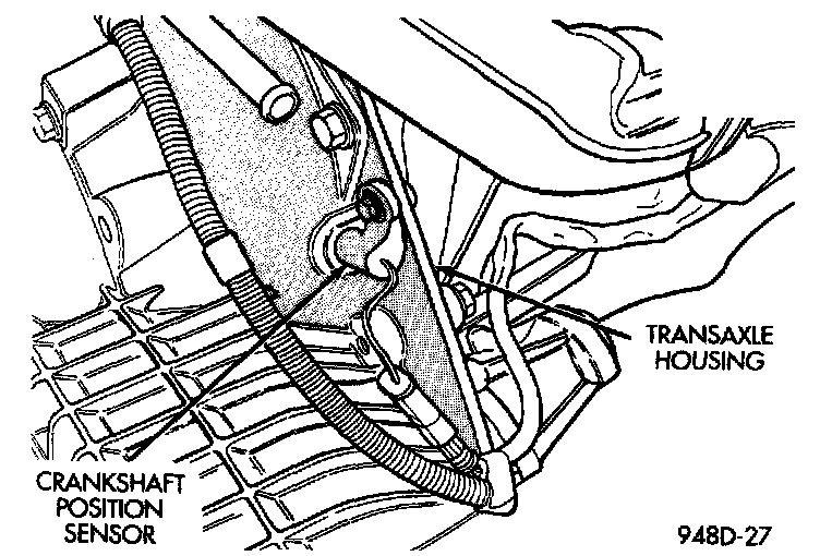 The crankshaft position sensor is located in the transaxle housing, above the vehicle speed sensor. The bottom of the sensor is positioned next to the drive plate. The distance between the bottom of sensor and the drive plate is critical to the operation of the system. When servicing the crankshaft position sensor, refer to the appropriate Multi-Port Fuel Injection Service Procedures.